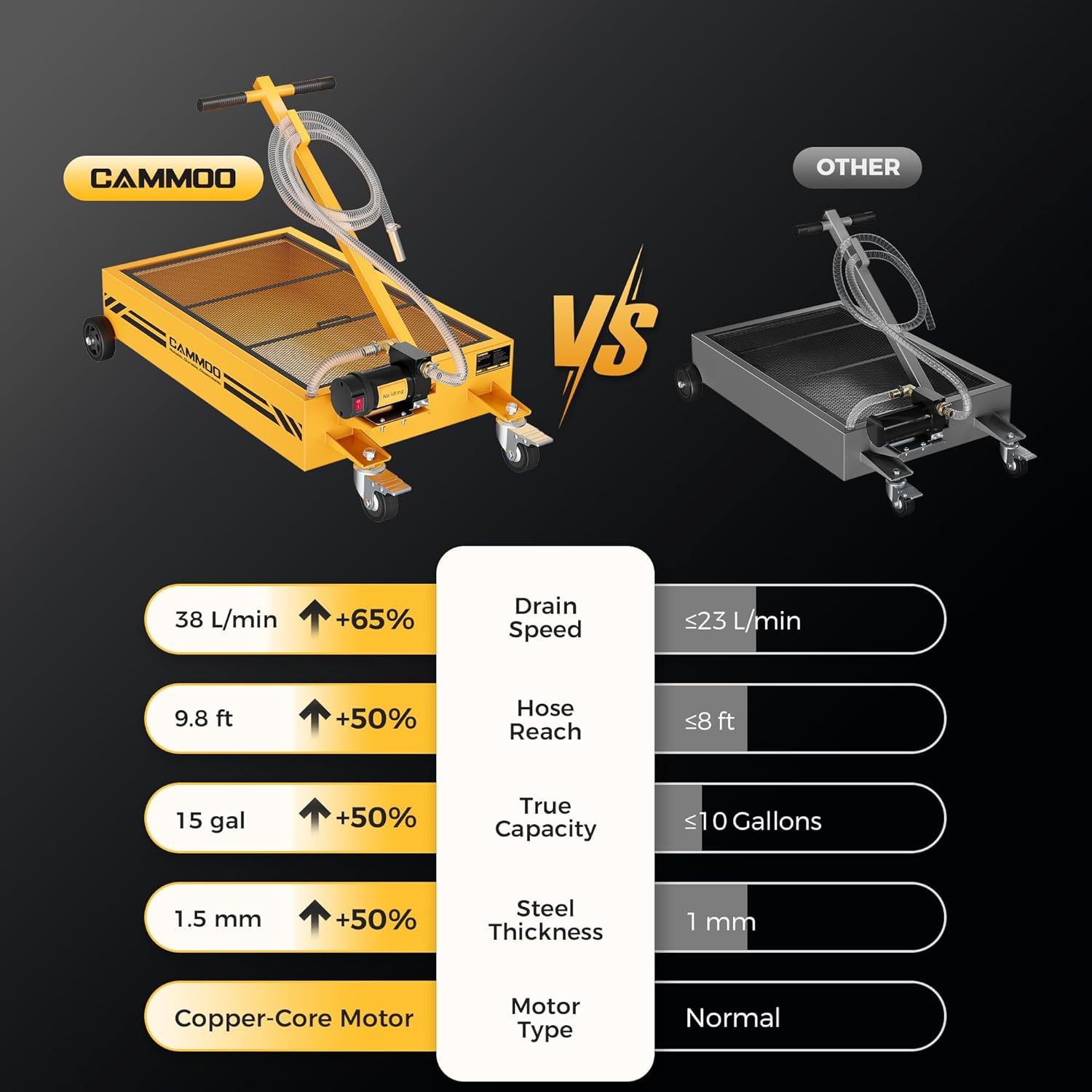 - High Capacity:Oversized 31.5" x 19.7" x 5.7"Steel tank delivers a verified 15 gallons and provides a bigger footprint than standard oil drain pans so shop owners, fleet managers, farmers and DIYers can drain a full-size pickup, two RVs or four sedans in one go with less lifting, fewer trips to the recycler and more time for paid jobs. It works with all common waste oils (motor, hydraulic, etc.)—gasoline explicitly excluded.