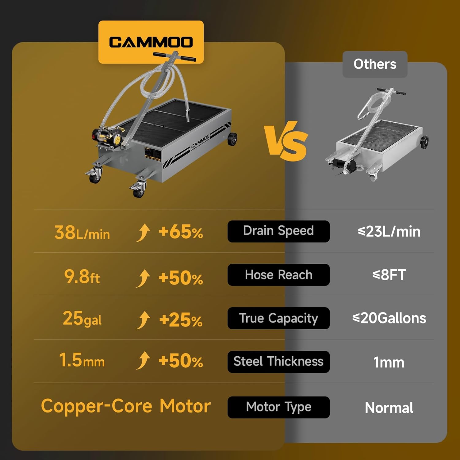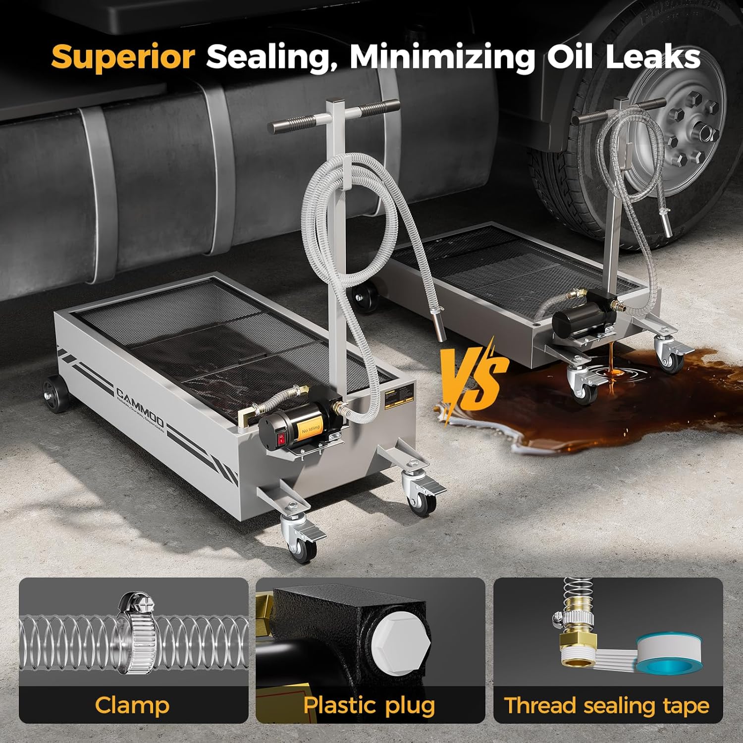- High Capacity:Oversized 39.76" x 23.23" x 8.5" steel tank delivers a verified 25 gallons and provides a bigger footprint than standard oil drain pans so shop owners, fleet managers, farmers and DIYers can drain a full-size pickup, two RVs or four sedans in one go with less lifting, fewer trips to the recycler and more time for paid jobs. It works with all common waste oils (motor, hydraulic, etc.)—gasoline explicitly excluded.