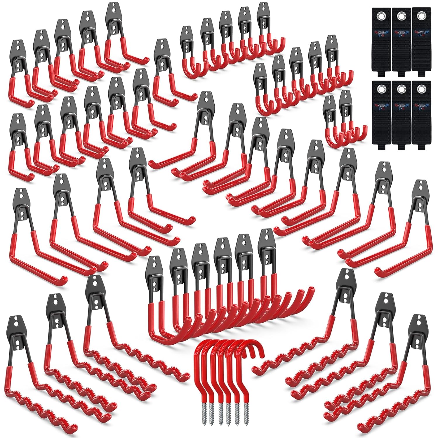 - Utility Hooks for Garage Hooks Bulk Set: 6 large size extension cord organizers and 60pcs garage wall hooks in 7 different sizes:6 large garage wave hooks,6 large U type garage hanging hooks, 6 medium U type heavy duty garage hooks, 12 small U type utility hooks, 6 medium J type tool hangers and 12 small J type ladder hangers,6 bike hooks for garage wall.All the screws and anchors included,multi-functions in one set of utility hooks for garage