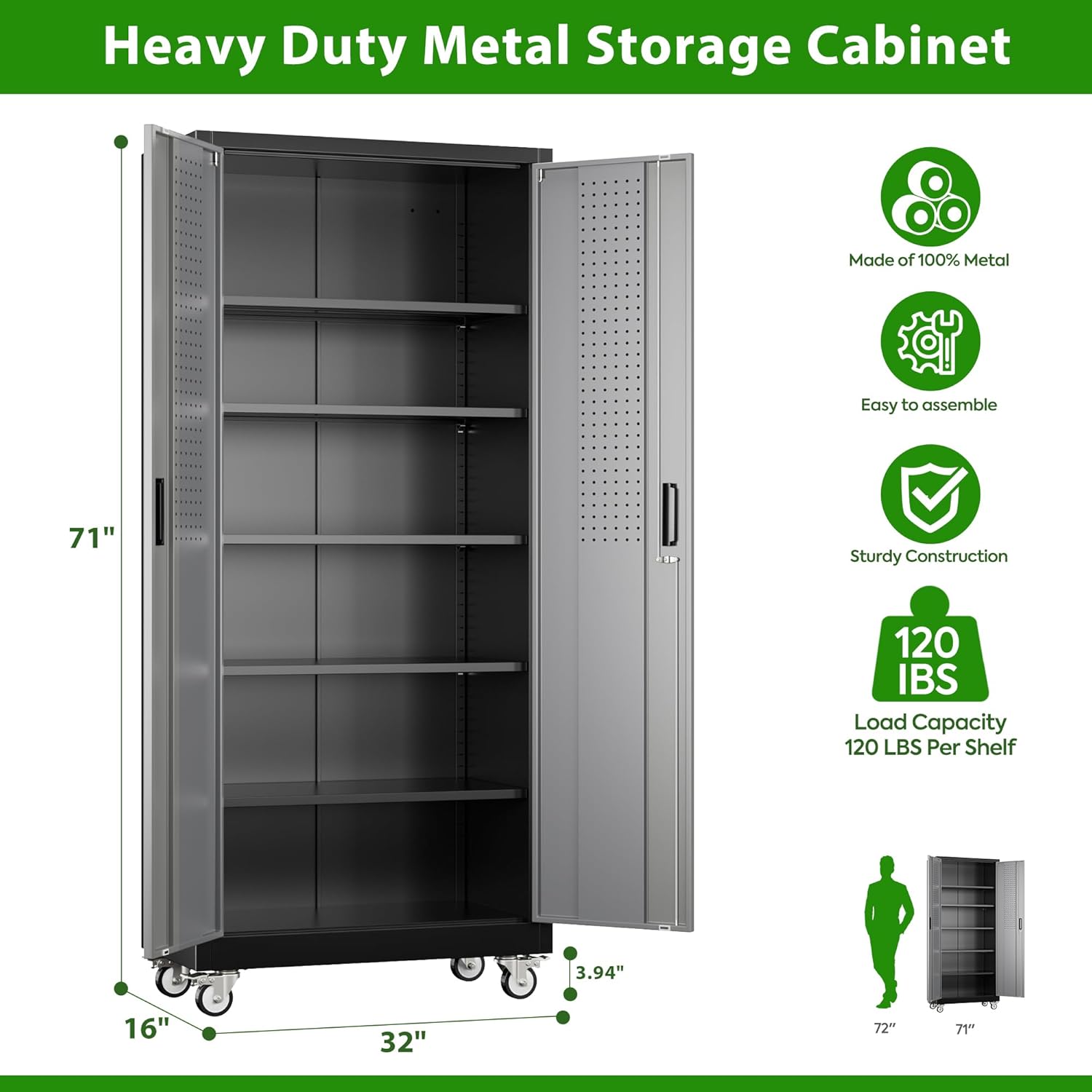 - Larger and Deeper Sizes:Metal Garage Storage Cabinet with Wheels and Pegboard 71'' x 32'' x 16'',The widened and deepened design allows you to obtain larger storage space.