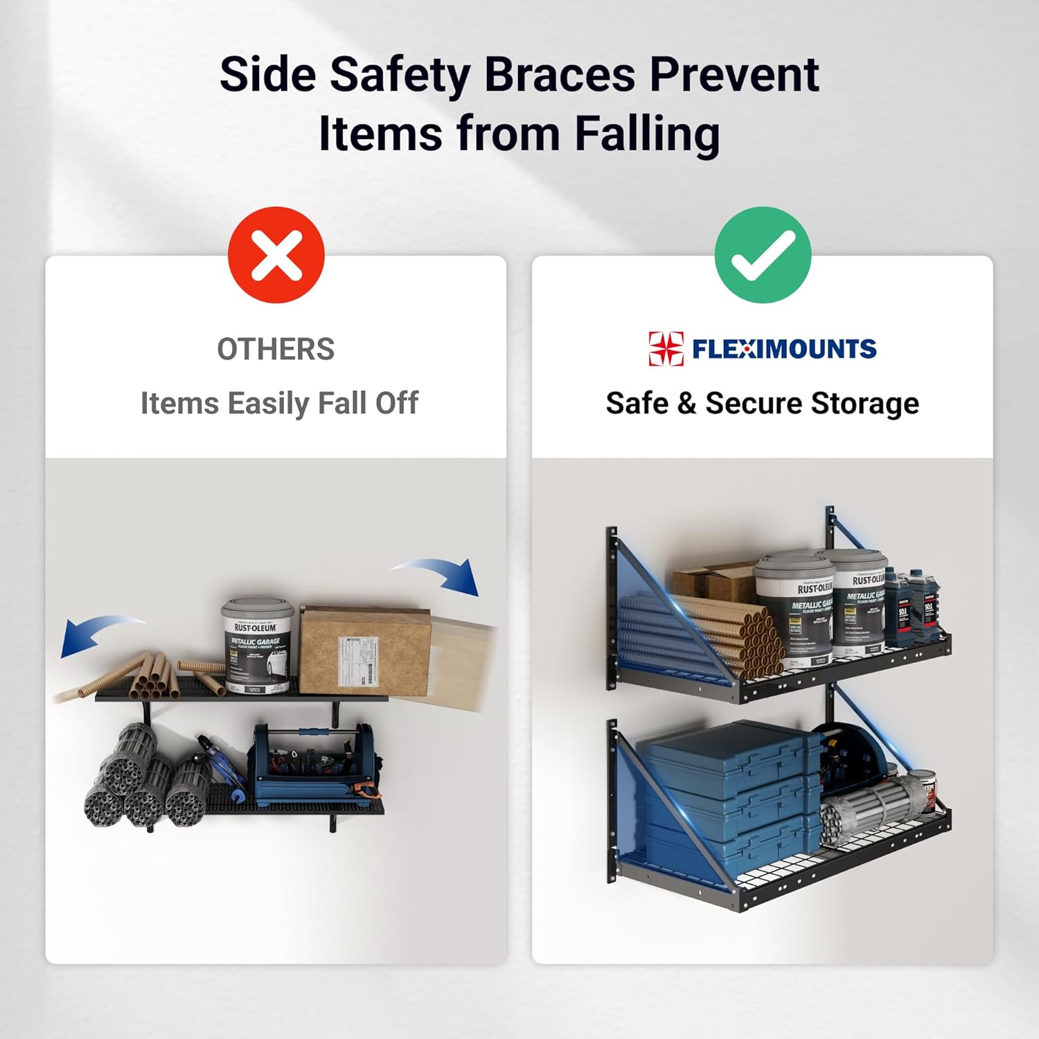 FLEXIMOUNTS 2-Pack 2x4ft Garage Wall Shelving - Heavy Duty Garage Storage Rack, 440 lbs Load Capacity with Brace Guardrail, Organization System for Tools, Heavy Bins, Sports Equipment, Utility Room