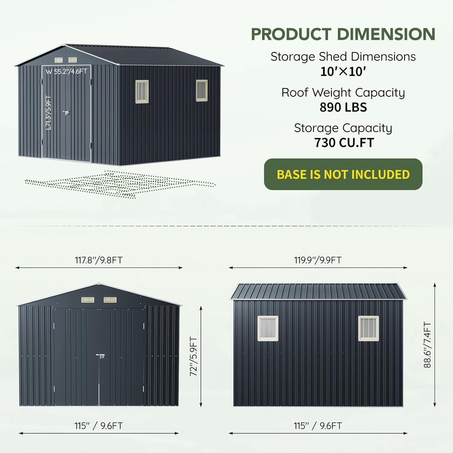 10x10 FT Outdoor Metal Storage Shed, Double Swing Doors, 2 Clear Windows,Tool Shed for Garden, Patio, Backyard
