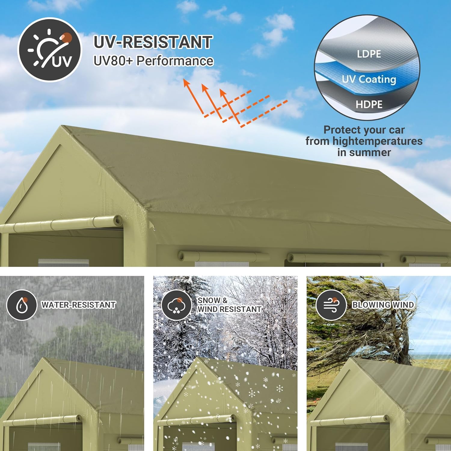 • 【Heavy Duty Carport】The carport canopy is made of 180 grams PE tarpaulin with industrial grade galvanized steel and reinforced crossbars, with artfully welded frame joints. It can withstand wind gusts of over 55 MPH and protects your car or boat from sun, rain and UV rays.