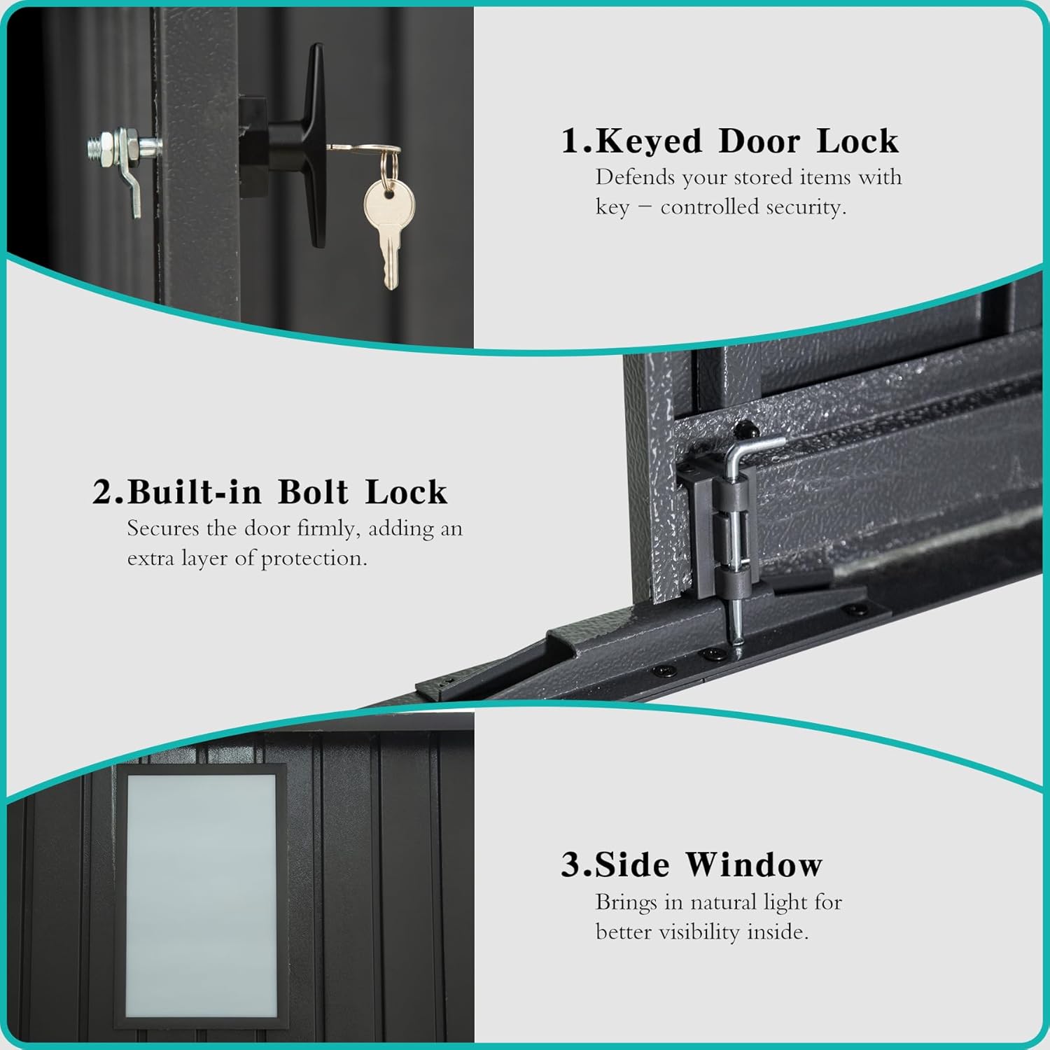 - Lockable Security & Stability - The lockable design with sturdy latches protects your valuables from unauthorized access. For added stability, the shed can be anchored to a concrete foundation or secured into soft ground using auger anchors, offering reliable protection even in strong winds.