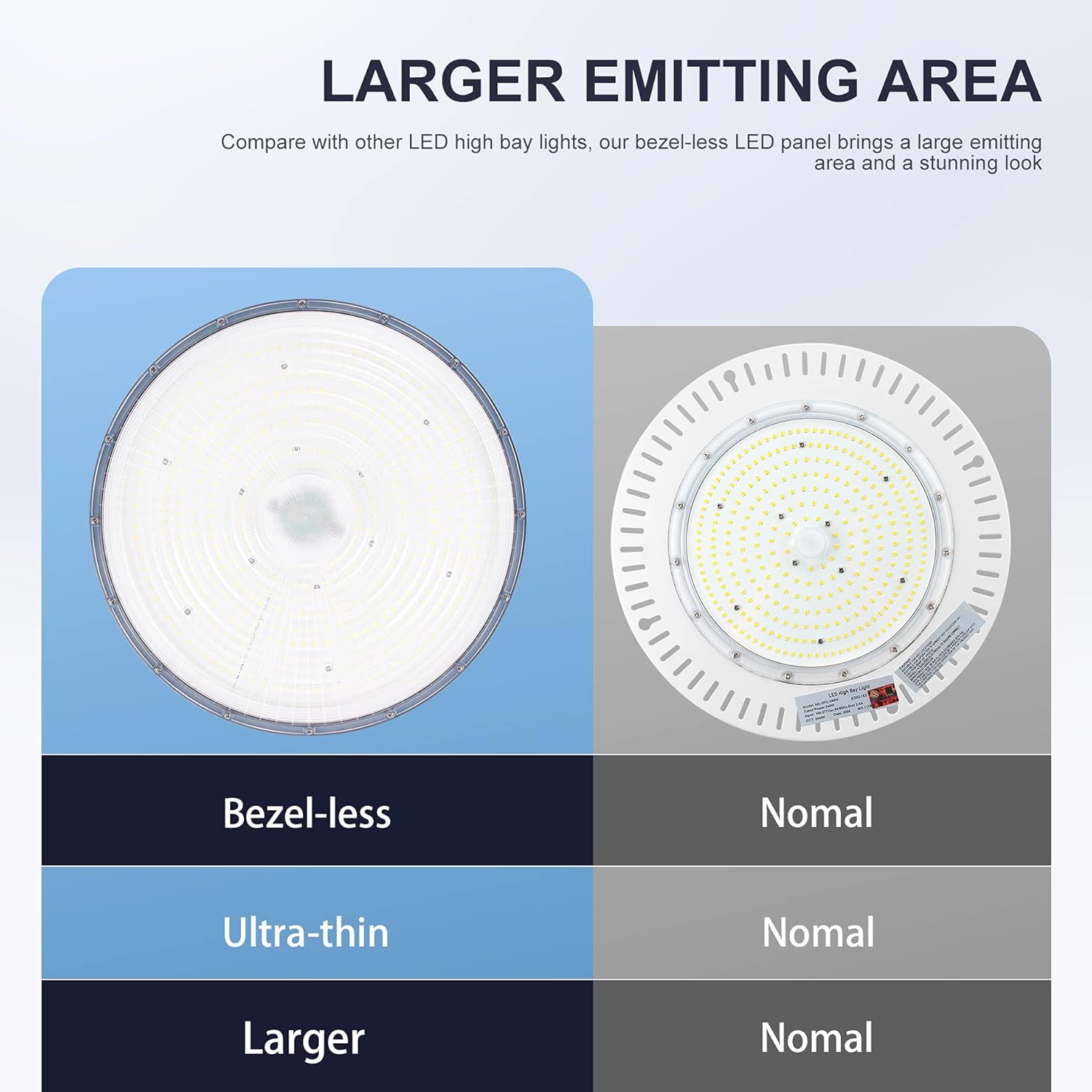 - UNIQUE PRACTICAL DESIGN: Relative to other high bay lights that have 9 inches in diameter, our bezel-less lights have a diameter up to 12.6 inches, the lighting panel size is 1-2 times the size of the others. A larger light-emitting area means a greater range of lighting